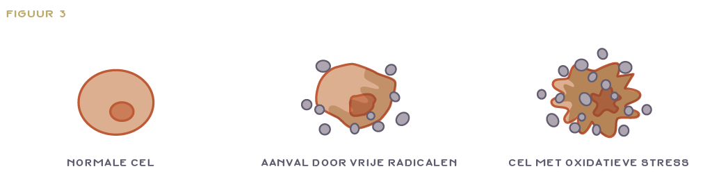 Resultaten uit onderzoek suggereren dat oxidatieve schade invloed heeft op de algehele vitaliteit van het lichaam en een sleutelrol speelt in huidveroudering (zie figuur 2). ROS zijn moleculen die kunnen ontstaan tijdens de ontkoppeling van elektronen in biochemische processen of onder invloed van externe factoren zoals UV-straling. Vanwege hun biochemische activiteit binden ze zich gemakkelijk aan andere moleculen. Een overvloed aan vrije radicalen, vooral wanneer het lichaam niet over voldoende antioxidanten beschikt, kan ernstige schade toebrengen aan cellulaire structuren, wat tot oxidatieve stress (OS) leidt. OS ontstaat wanneer de balans tussen de productie van vrije radicalen en het vermogen van het lichaam om deze te neutraliseren, verstoord raakt. Dit kan leiden tot systemische schade aan cellulaire structuren, wat de veerkracht van het lichaam aantast. In de huid versnelt OS de afbraak van essentiële huidstructuren zoals collageen en elastine, die zorgen voor stevigheid en elasticiteit van de huid. Dit versterkt zichtbare tekenen van veroudering zoals rimpelvorming, verlies van huidelasticiteit, droogheid en pigmentatieverschillen.1,2,3,11,12