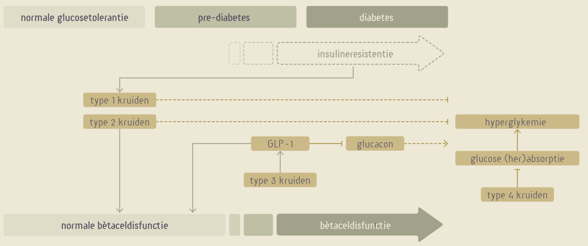 Kruideninzet om deze pathway te beïnvloeden, staat nog in de kinderschoenen. Inuline-type fructanen uit onder andere Cichorium intybus verhoogden in diermodellen de productie van GLP-1. Andere planten(stoffen), zoals Pterocarpus marsupium en quercetine, remmen DPP-4 in vitro. Meer onderzoek is nodig om de effecten bij mensen te onderzoeken.2